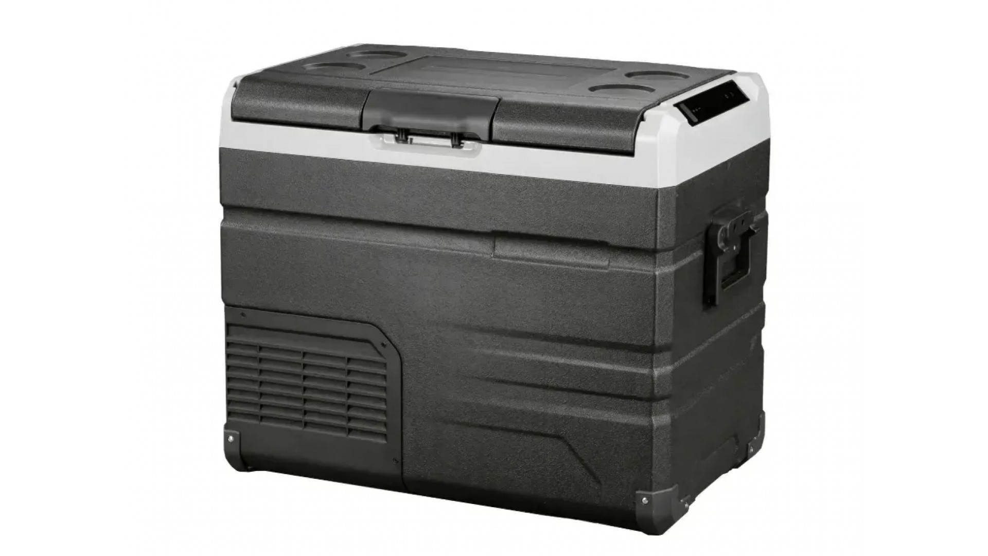 На верхней панели — четыре подстаканника: можно поставить банку, бутылку или термокружку. Это удобно в пути, на стоянке или в кемпинге, когда холодильник используется как импровизированный столик.