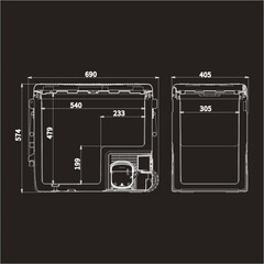 На корпусе есть панель управления с дисплеем, с её помощью можно настроить рабочую температуру от +20 °C до -20 °C, автохолодильник будет автоматически поддерживать её. Так же можно выбрать один из двух режимов работы. Режим «MAX» (Турборежим) позволит быстро заморозить продукты, благодаря работе на максимальной мощности. Выбрав «ECO» (Экономичный) режим работы, холодильник будет дольше достигать заданного значения температуры, но при этом расходует меньше электроэнергии. В случае каких-либо сбоев в работе, на дисплее отображается код ошибки, что подскажет в чём именно проблема. Автохолодильник оснащён ручкой и колёсиками, что обеспечивает удобную ручную транспортировку.