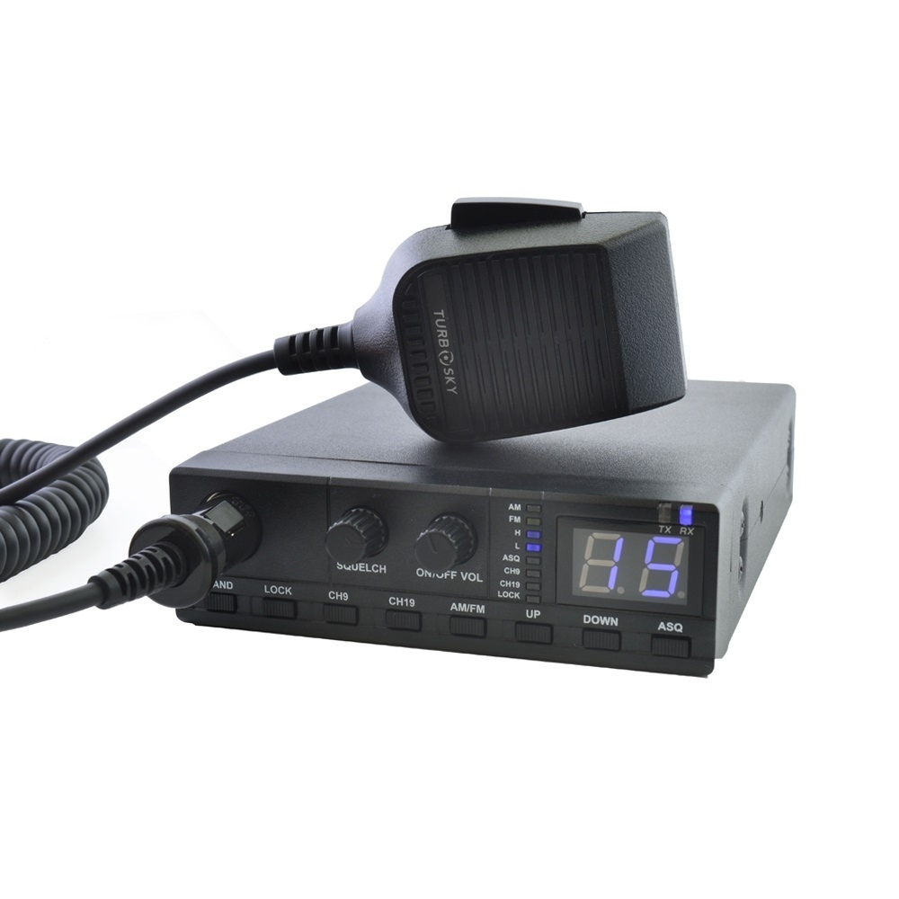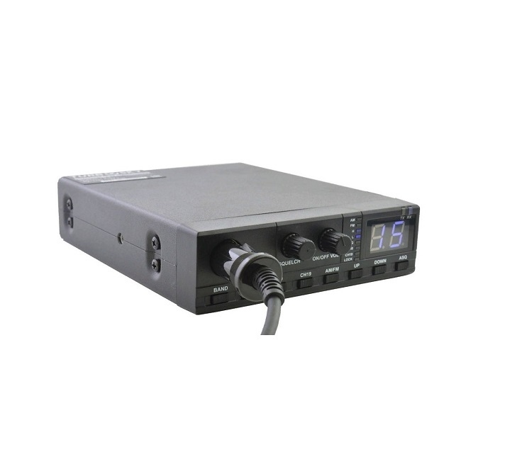 Автомобильная радиостанция Си-Би диапазона. Преимущество радиостанции в наличии на налицевой панели кнопок включения аварийных каналов CH9 и CH19 и кнопки блокировки органов управления для исключения непреднамеренного нажатия. В случае активированной кнопки LOCK функционировать будет лишь клавиша тангенты.